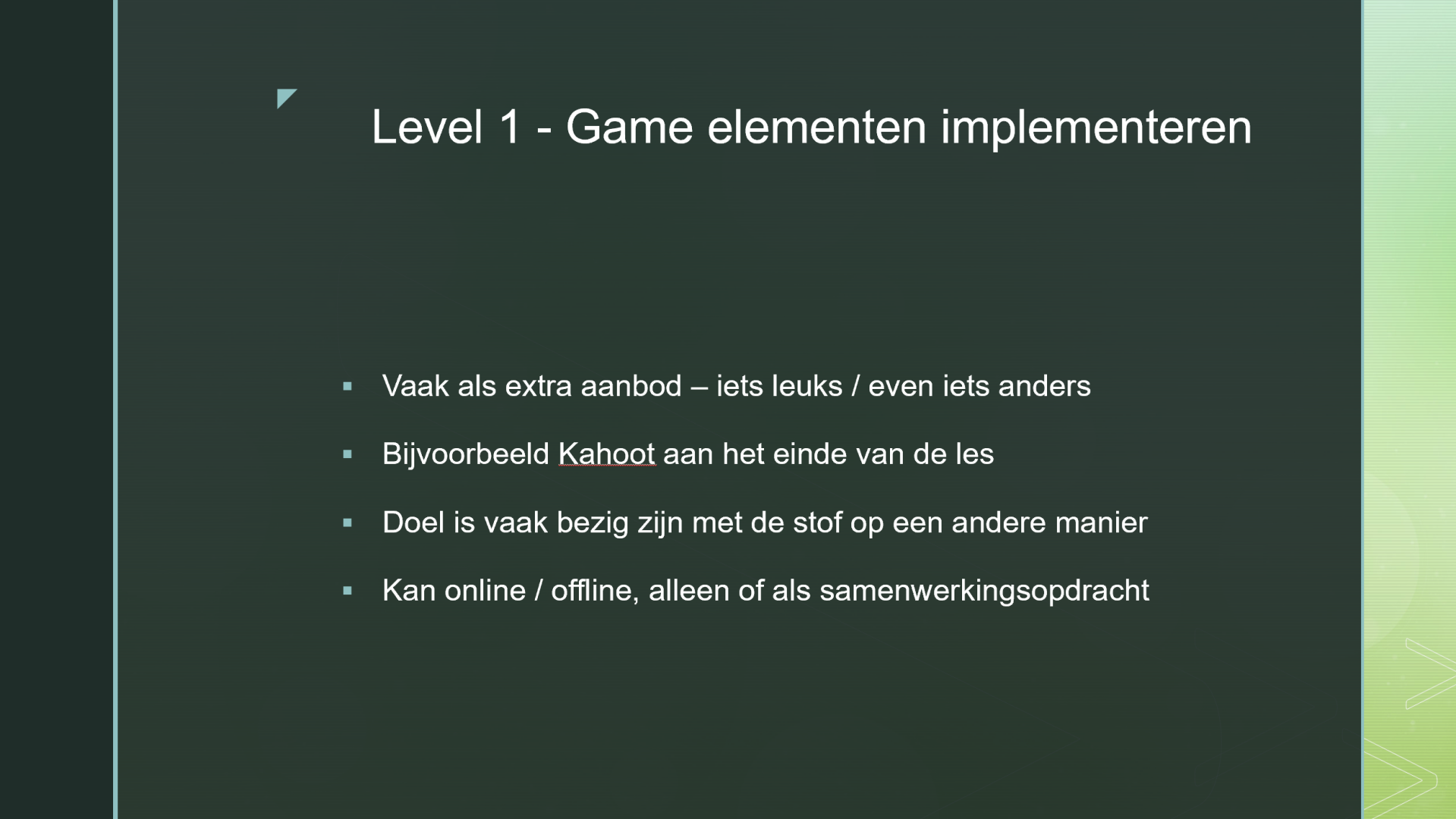 1. Klein niveau: Hier voeg je één of enkele spelelementen toe aan bestaande lesonderdelen om de betrokkenheid van studenten te vergroten.